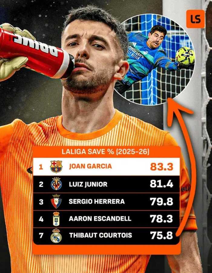 根据LiveScore的统计,乔安-加西亚是本赛季西甲联赛中扑救成功率最高的门将: