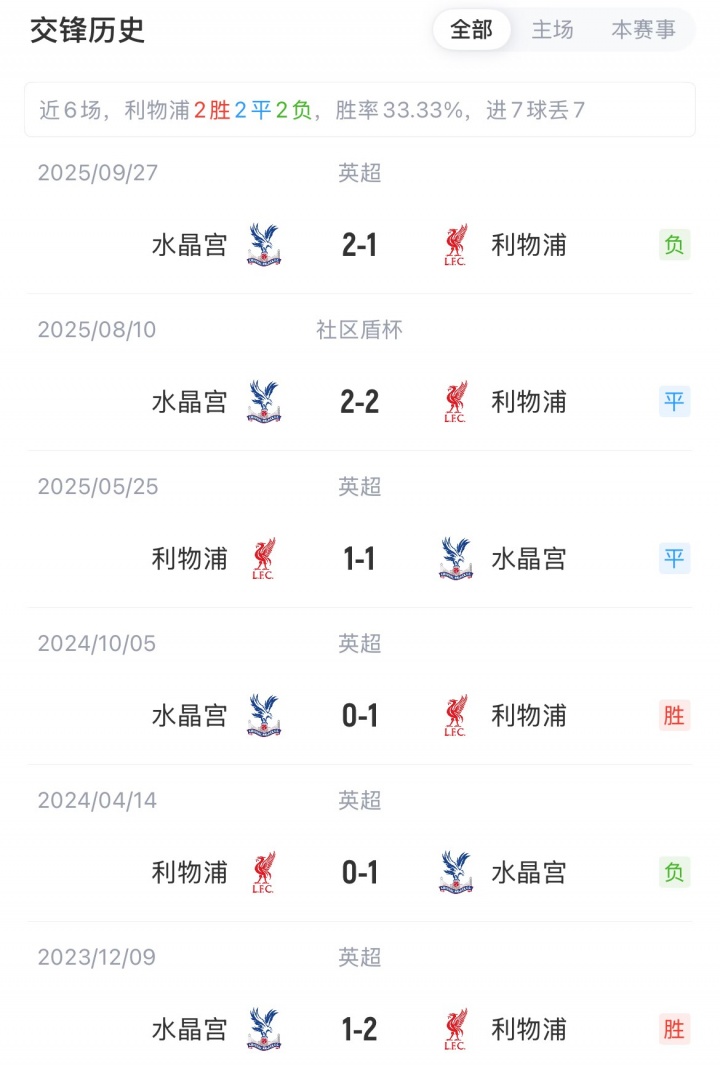 利物浦对水晶宫已三场不胜。