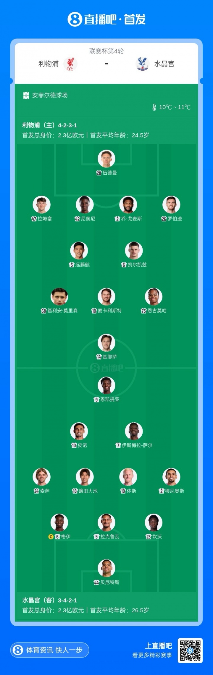 利物浦首发:28-伍德曼、2-戈麦斯、6-凯尔凯兹、26-罗伯逊、47-拉姆塞、42-尼奥尼、3-远藤航、68-莫里森、10-麦卡利斯特、14-基耶萨、73-恩古莫哈